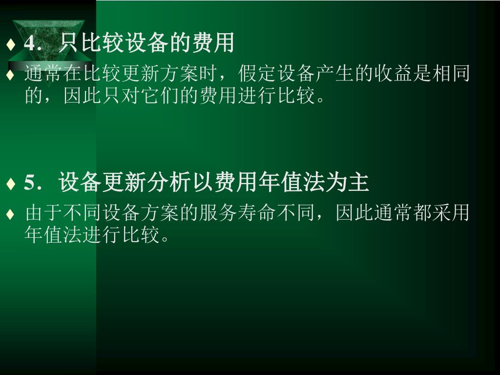 4.只比较设备的费用 • 通常在比较更新方案时,假定设备产生的收益是相同的,因此只对它们的费用进行比较。 • 5.设备更新分析以费用年值法为主 • 由于不同设备方案的服务寿命不同,因此通常都采用年值法进行比较。
