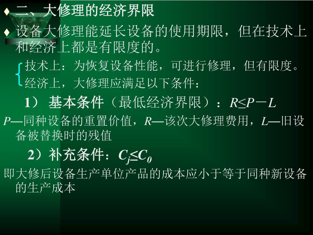 二、大修理的经济界限 • 设备大修理能延长设备的使用期限,但在技术上和经济上都是有限度的。 技术上:为恢复设备性能,可进行修理,但有限度。 经济上,大修理应满足以下条件: 1) 基本条件(最低经济界限):R≤P-L P—同种设备的重置价值,R—该次大修理费用,L—旧设备被替换时的残值 2)补充条件:Cj≤C0 即大修后设备生产单位产品的成本应小于等于同种新设备的生产成本