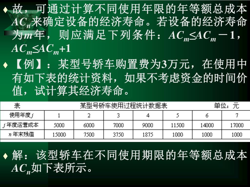 故,可通过计算不同使用年限的年等额总成本ACn来确定设备的经济寿命。若设备的经济寿命为m年,则应满足下列条件:ACm≤ACm-1,ACm≤ACm+1故,可通过计算不同使用年限的年等额总成本ACn来确定设备的经济寿命。若设备的经济寿命为m年,则应满足下列条件:ACm≤ACm-1,ACm≤ACm+1 • 【例】:某型号轿车购置费为3万元,在使用中有如下表的统计资料,如果不考虑资金的时间价值,试计算其经济寿命。 • 解:该型轿车在不同使用期限的年等额总成本ACn如下表所示。