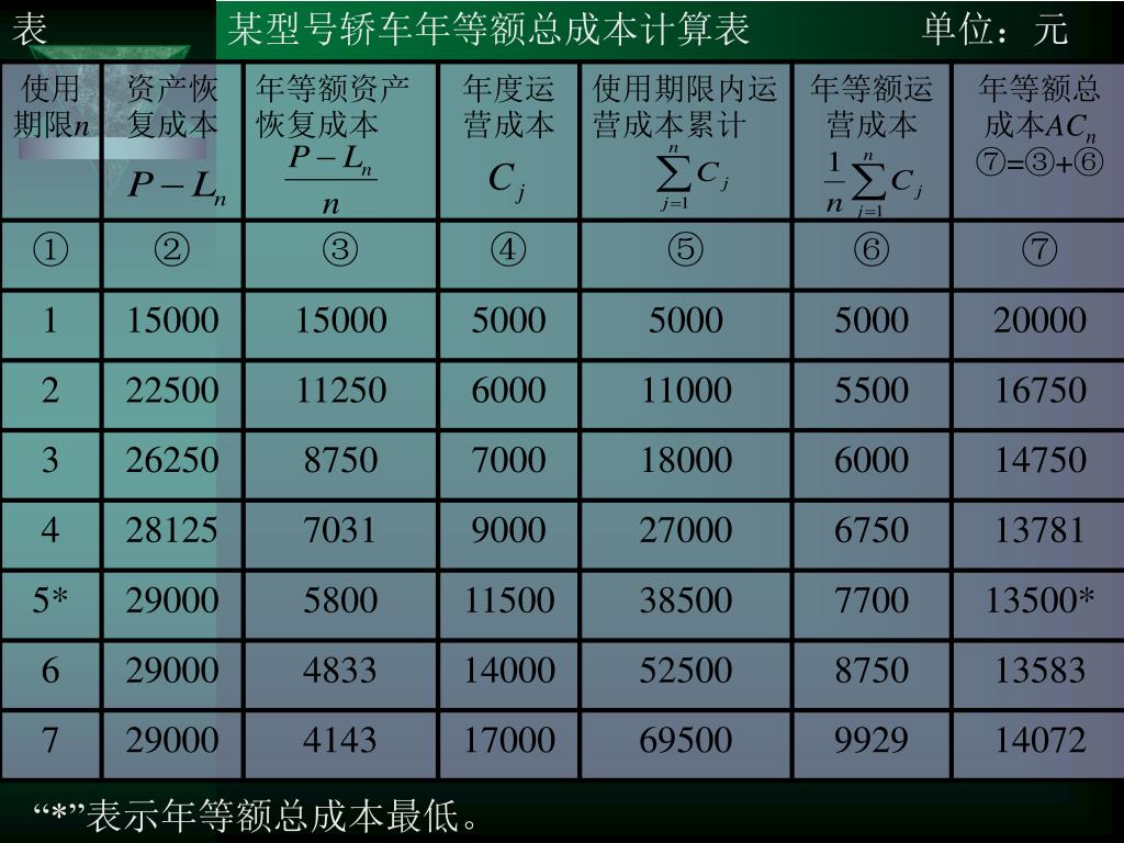 表 某型号轿车年等额总成本计算表 单位:元 “*”表示年等额总成本最低。