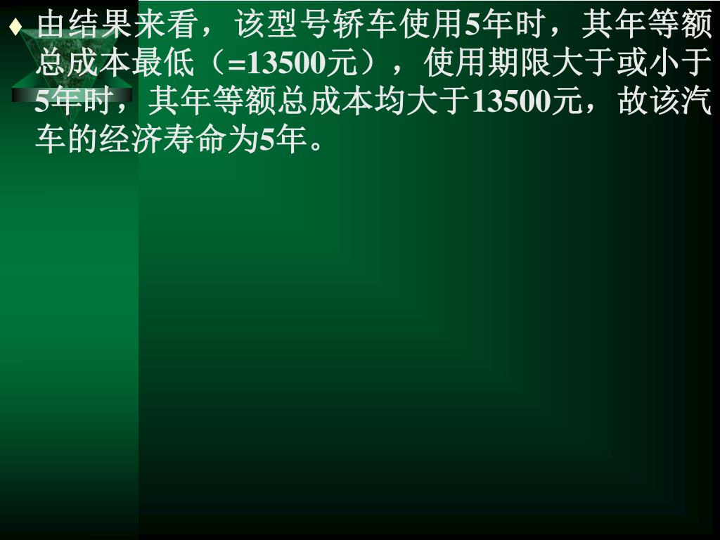 由结果来看,该型号轿车使用5年时,其年等额总成本最低(=13500元),使用期限大于或小于5年时,其年等额总成本均大于13500元,故该汽车的经济寿命为5年。由结果来看,该型号轿车使用5年时,其年等额总成本最低(=13500元),使用期限大于或小于5年时,其年等额总成本均大于13500元,故该汽车的经济寿命为5年。
