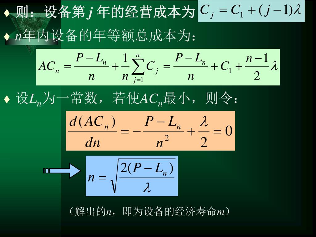 则:设备第 j 年的经营成本为 • n年内设备的年等额总成本为: • 设Ln为一常数,若使ACn最小,则令: (解出的n,即为设备的经济寿命m)