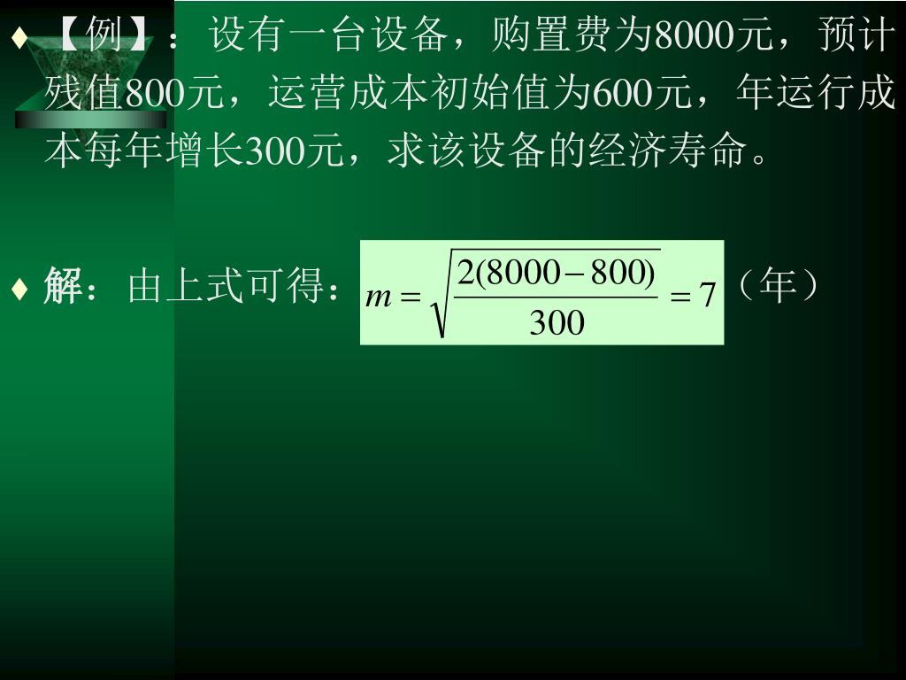【例】:设有一台设备,购置费为8000元,预计残值800元,运营成本初始值为600元,年运行成本每年增长300元,求该设备的经济寿命。【例】:设有一台设备,购置费为8000元,预计残值800元,运营成本初始值为600元,年运行成本每年增长300元,求该设备的经济寿命。 • 解:由上式可得: (年)