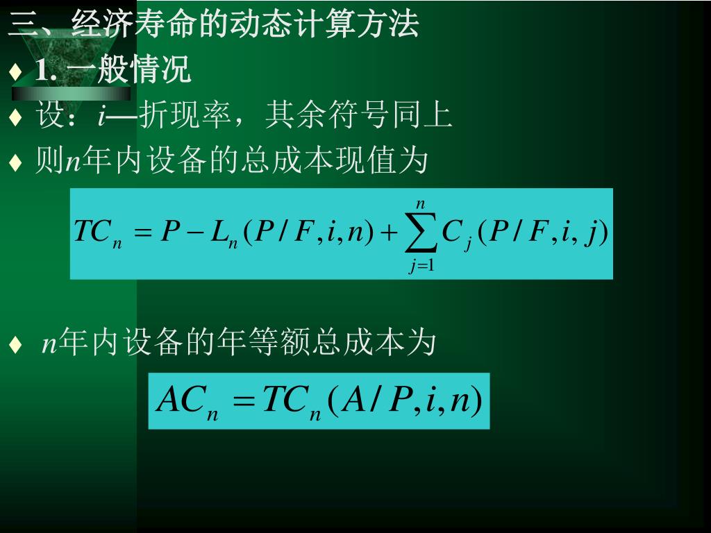 三、经济寿命的动态计算方法 • 1. 一般情况 • 设:i—折现率,其余符号同上 • 则n年内设备的总成本现值为 • n年内设备的年等额总成本为