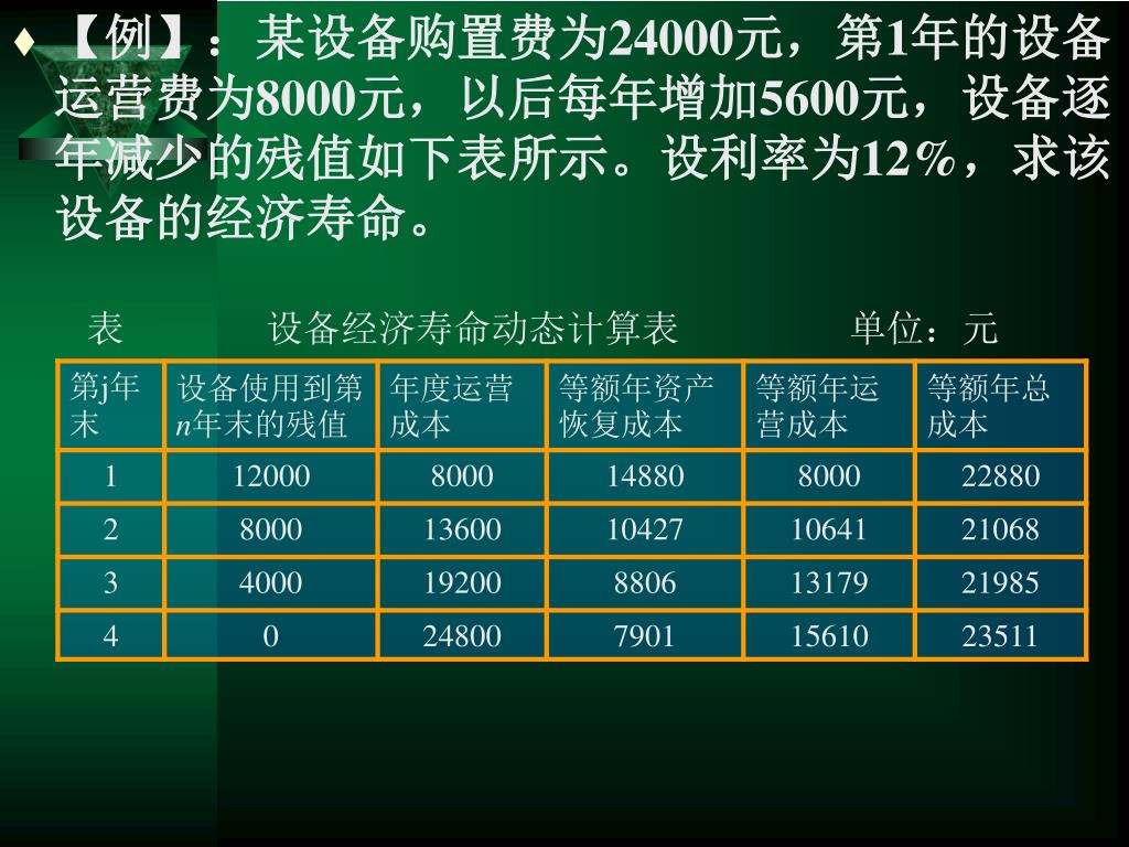 【例】:某设备购置费为24000元,第1年的设备运营费为8000元,以后每年增加5600元,设备逐年减少的残值如下表所示。设利率为12%,求该设备的经济寿命。【例】:某设备购置费为24000元,第1年的设备运营费为8000元,以后每年增加5600元,设备逐年减少的残值如下表所示。设利率为12%,求该设备的经济寿命。 表 设备经济寿命动态计算表 单位:元