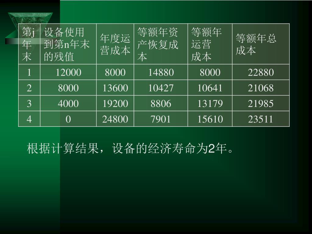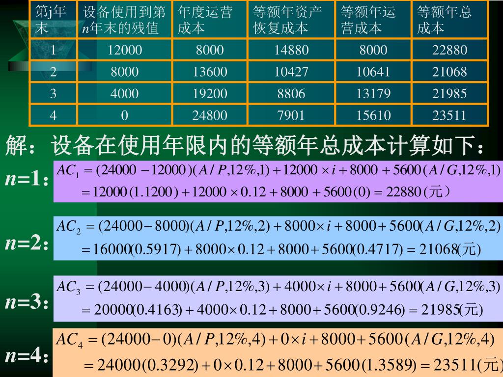 解:设备在使用年限内的等额年总成本计算如下:解:设备在使用年限内的等额年总成本计算如下: n=1: n=2: n=3: n=4: