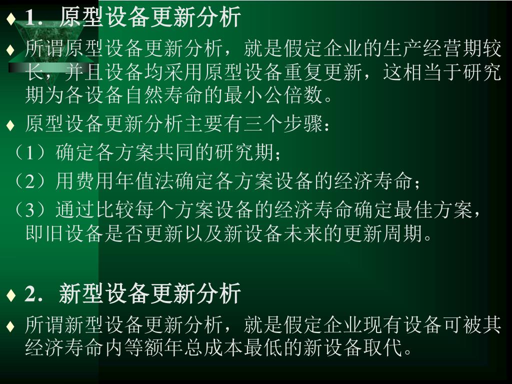 1.原型设备更新分析 • 所谓原型设备更新分析,就是假定企业的生产经营期较长,并且设备均采用原型设备重复更新,这相当于研究期为各设备自然寿命的最小公倍数。 • 原型设备更新分析主要有三个步骤: (1)确定各方案共同的研究期; (2)用费用年值法确定各方案设备的经济寿命; (3)通过比较每个方案设备的经济寿命确定最佳方案,即旧设备是否更新以及新设备未来的更新周期。 • 2.新型设备更新分析 • 所谓新型设备更新分析,就是假定企业现有设备可被其经济寿命内等额年总成本最低的新设备取代。