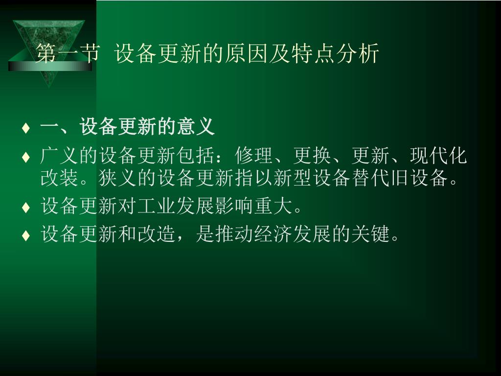 第一节 设备更新的原因及特点分析 • 一、设备更新的意义 • 广义的设备更新包括:修理、更换、更新、现代化改装。狭义的设备更新指以新型设备替代旧设备。 • 设备更新对工业发展影响重大。 • 设备更新和改造,是推动经济发展的关键。
