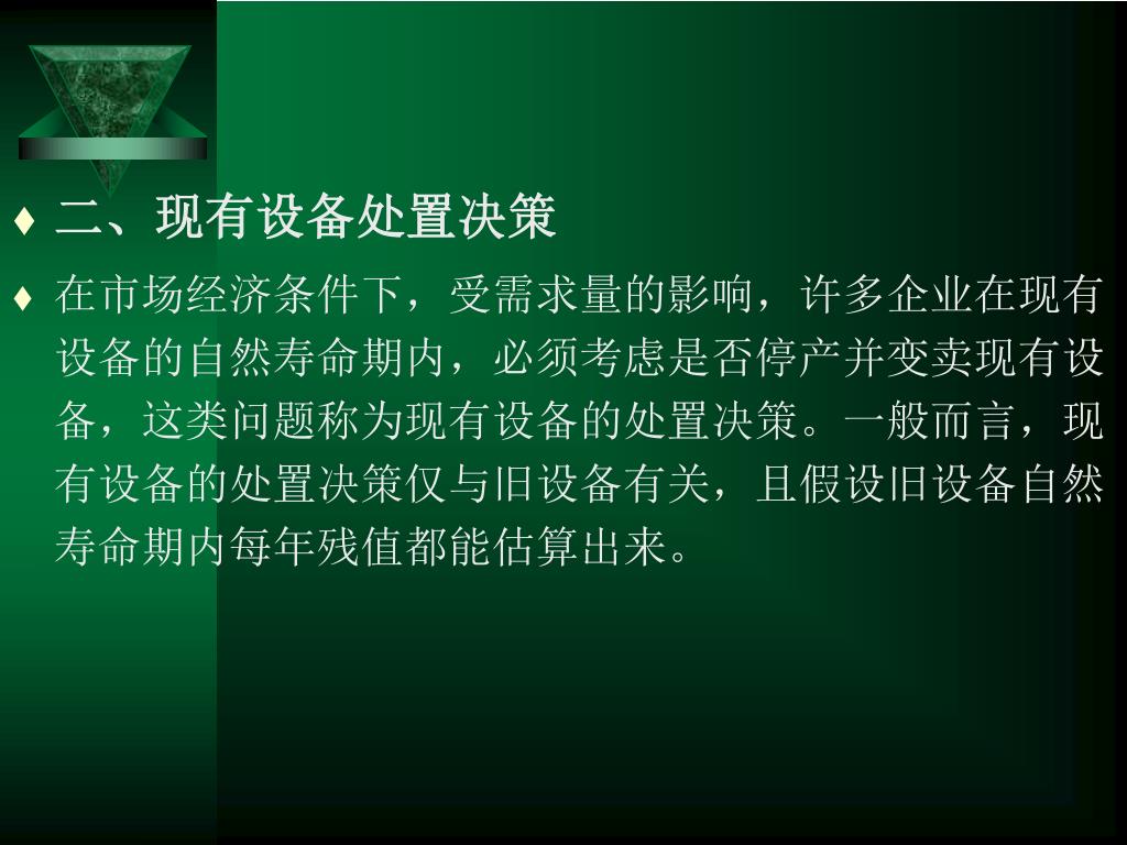 二、现有设备处置决策 • 在市场经济条件下,受需求量的影响,许多企业在现有设备的自然寿命期内,必须考虑是否停产并变卖现有设备,这类问题称为现有设备的处置决策。一般而言,现有设备的处置决策仅与旧设备有关,且假设旧设备自然寿命期内每年残值都能估算出来。