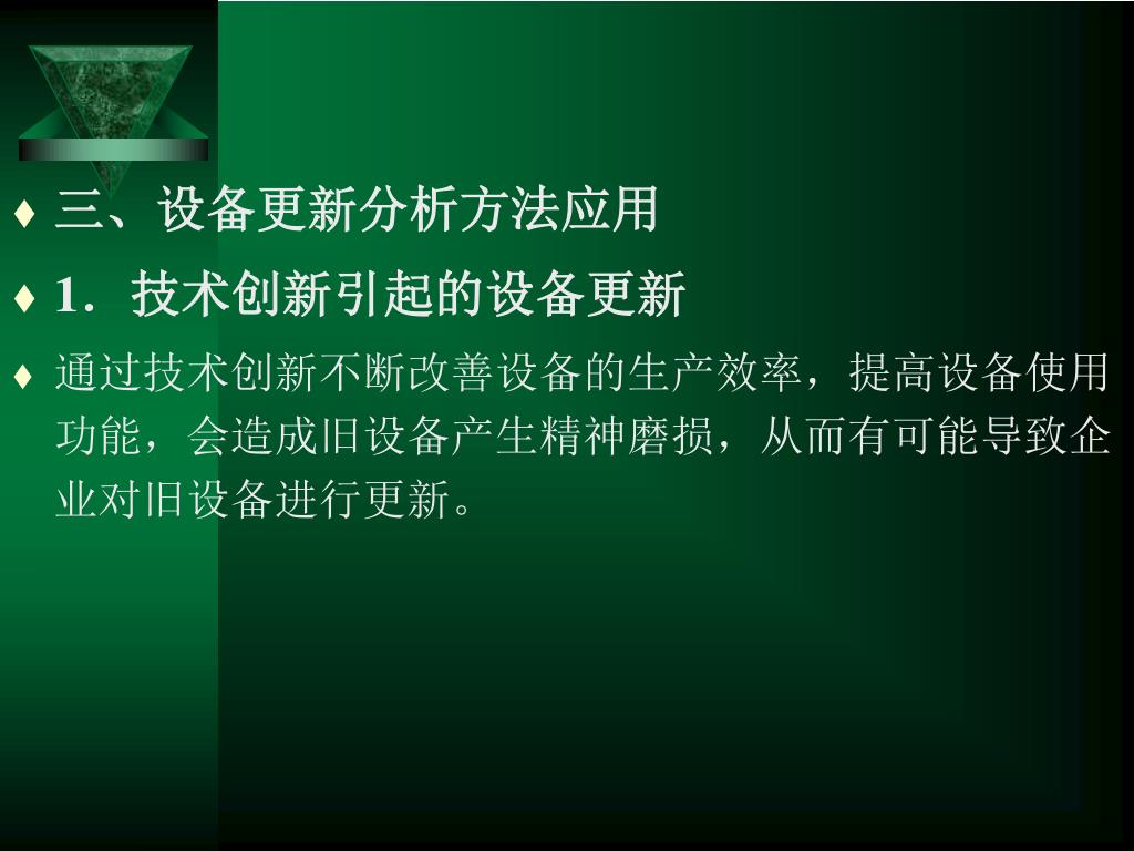 三、设备更新分析方法应用 • 1.技术创新引起的设备更新 • 通过技术创新不断改善设备的生产效率,提高设备使用功能,会造成旧设备产生精神磨损,从而有可能导致企业对旧设备进行更新。