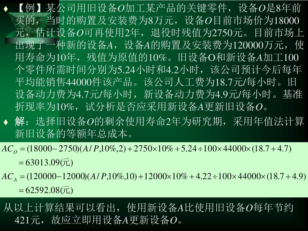 【例】某公司用旧设备O加工某产品的关键零件,设备O是8年前买的,当时的购置及安装费为8万元,设备O目前市场价为18000元,估计设备O可再使用2年,退役时残值为2750元。目前市场上出现了一种新的设备A,设备A的购置及安装费为120000万元,使用寿命为10年,残值为原值的10%。旧设备O和新设备A加工100个零件所需时间分别为5.24小时和4.2小时,该公司预计今后每年平均能销售44000件该产品。该公司人工费为18.7元/每小时。旧设备动力费为4.7元/每小时,新设备动力费为4.9元/每小时。基准折现率为10%,试分析是否应采用新设备A更新旧设备O。【例】某公司用旧设备O加工某产品的关键零件,设备O是8年前买的,当时的购置及安装费为8万元,设备O目前市场价为18000元,估计设备O可再使用2年,退役时残值为2750元。目前市场上出现了一种新的设备A,设备A的购置及安装费为120000万元,使用寿命为10年,残值为原值的10%。旧设备O和新设备A加工100个零件所需时间分别为5.24小时和4.2小时,该公司预计今后每年平均能销售44000件该产品。该公司人工费为18.7元/每小时。旧设备动力费为4.7元/每小时,新设备动力费为4.9元/每小时。基准折现率为10%,试分析是否应采用新设备A更新旧设备O。 • 解:选择旧设备O的剩余使用寿命2年为研究期,采用年值法计算新旧设备的等额年总成本。 从以上计算结果可以看出,使用新设备A比使用旧设备O每年节约421元,故应立即用设备A更新设备O。