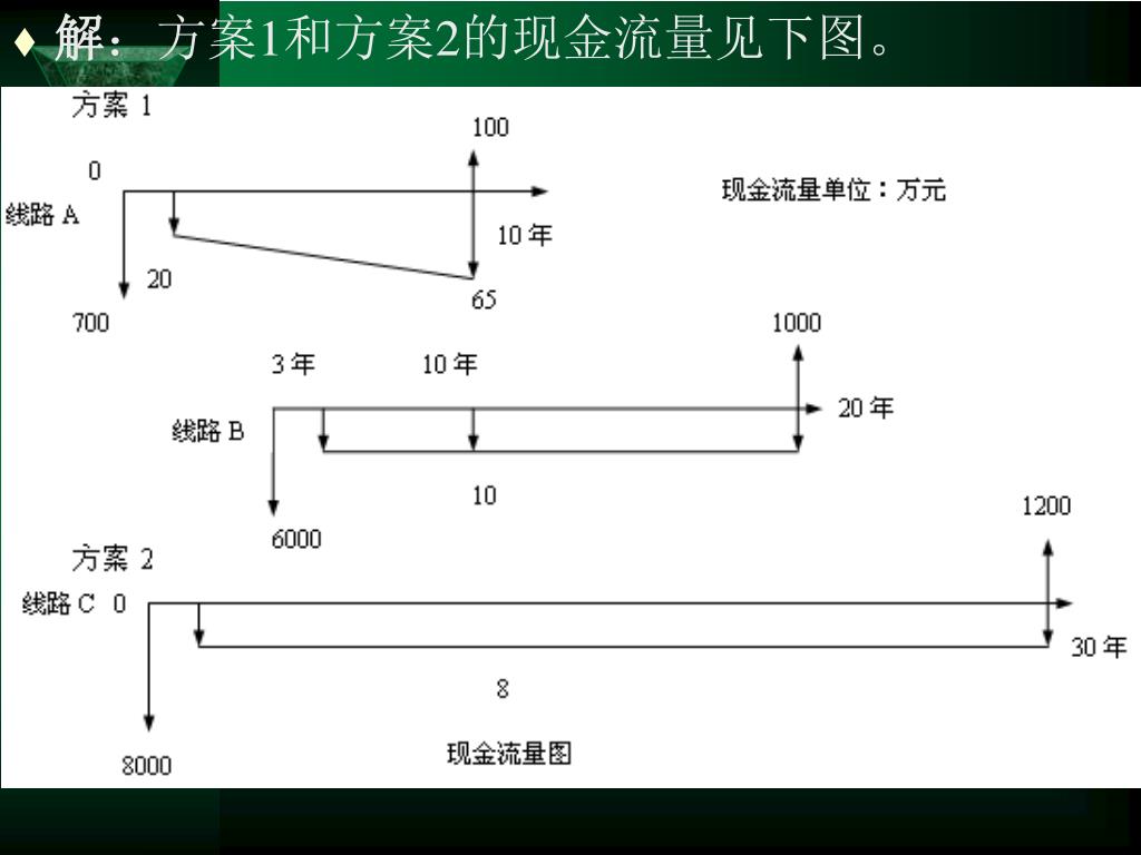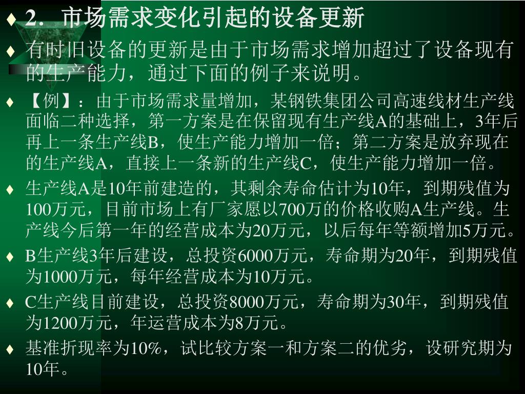 2.市场需求变化引起的设备更新 • 有时旧设备的更新是由于市场需求增加超过了设备现有的生产能力,通过下面的例子来说明。 • 【例】:由于市场需求量增加,某钢铁集团公司高速线材生产线面临二种选择,第一方案是在保留现有生产线A的基础上,3年后再上一条生产线B,使生产能力增加一倍;第二方案是放弃现在的生产线A,直接上一条新的生产线C,使生产能力增加一倍。 • 生产线A是10年前建造的,其剩余寿命估计为10年,到期残值为100万元,目前市场上有厂家愿以700万的价格收购A生产线。生产线今后第一年的经营成本为20万元,以后每年等额增加5万元。 • B生产线3年后建设,总投资6000万元,寿命期为20年,到期残值为1000万元,每年经营成本为10万元。 • C生产线目前建设,总投资8000万元,寿命期为30年,到期残值为1200万元,年运营成本为8万元。 • 基准折现率为10%,试比较方案一和方案二的优劣,设研究期为10年。