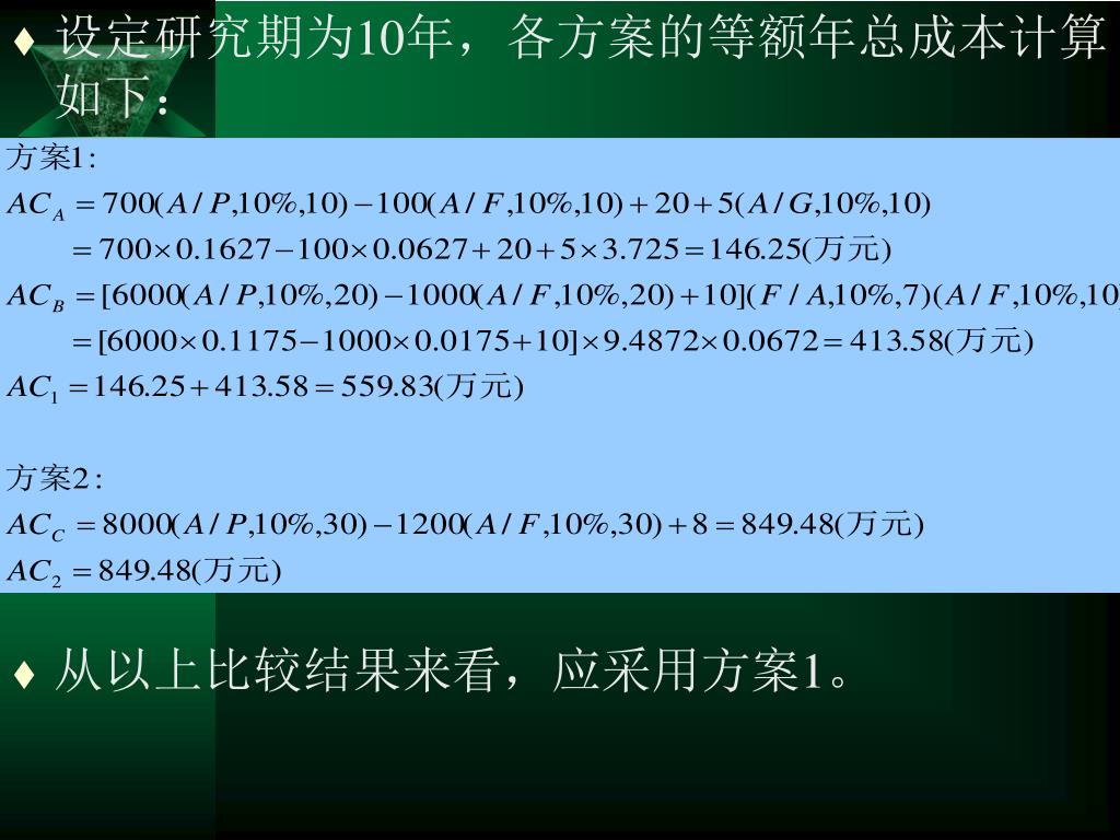 设定研究期为10年,各方案的等额年总成本计算如下:设定研究期为10年,各方案的等额年总成本计算如下: • 从以上比较结果来看,应采用方案1。