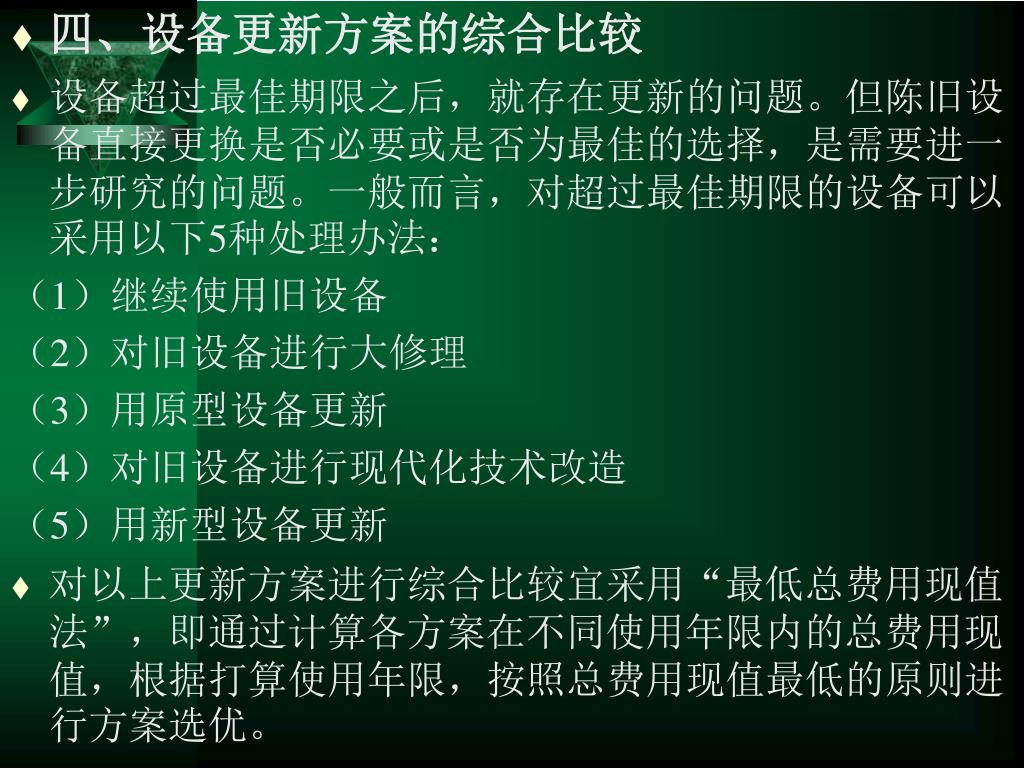 四、设备更新方案的综合比较 • 设备超过最佳期限之后,就存在更新的问题。但陈旧设备直接更换是否必要或是否为最佳的选择,是需要进一步研究的问题。一般而言,对超过最佳期限的设备可以采用以下5种处理办法: (1)继续使用旧设备 (2)对旧设备进行大修理 (3)用原型设备更新 (4)对旧设备进行现代化技术改造 (5)用新型设备更新 • 对以上更新方案进行综合比较宜采用“最低总费用现值法”,即通过计算各方案在不同使用年限内的总费用现值,根据打算使用年限,按照总费用现值最低的原则进行方案选优。