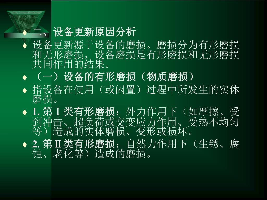 二、设备更新原因分析 • 设备更新源于设备的磨损。磨损分为有形磨损和无形磨损,设备磨损是有形磨损和无形磨损共同作用的结果。 • (一)设备的有形磨损(物质磨损) • 指设备在使用(或闲置)过程中所发生的实体磨损。 • 1. 第Ⅰ类有形磨损:外力作用下(如摩擦、受到冲击、超负荷或交变应力作用、受热不均匀等)造成的实体磨损、变形或损坏。 • 2. 第Ⅱ类有形磨损:自然力作用下(生锈、腐蚀、老化等)造成的磨损。