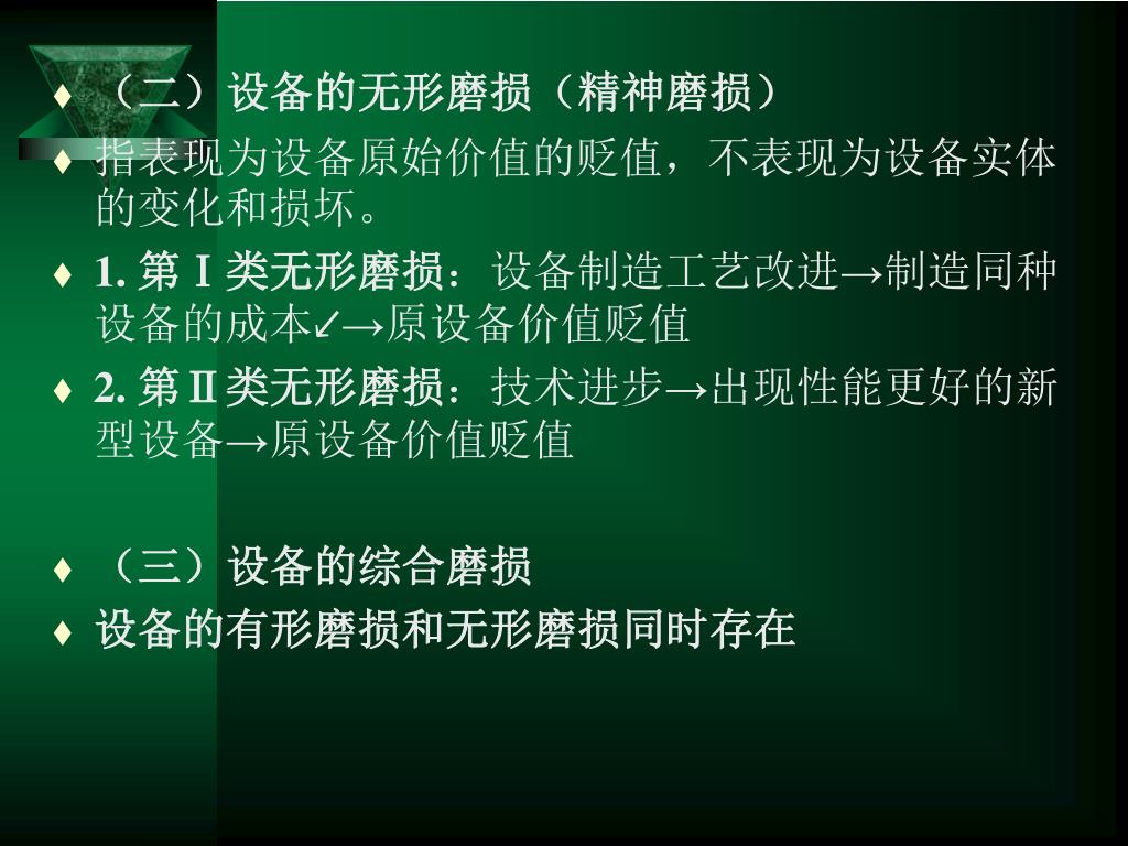 (二)设备的无形磨损(精神磨损) • 指表现为设备原始价值的贬值,不表现为设备实体的变化和损坏。 • 1. 第Ⅰ类无形磨损:设备制造工艺改进→制造同种设备的成本↙→原设备价值贬值 • 2. 第Ⅱ类无形磨损:技术进步→出现性能更好的新型设备→原设备价值贬值 • (三)设备的综合磨损 • 设备的有形磨损和无形磨损同时存在