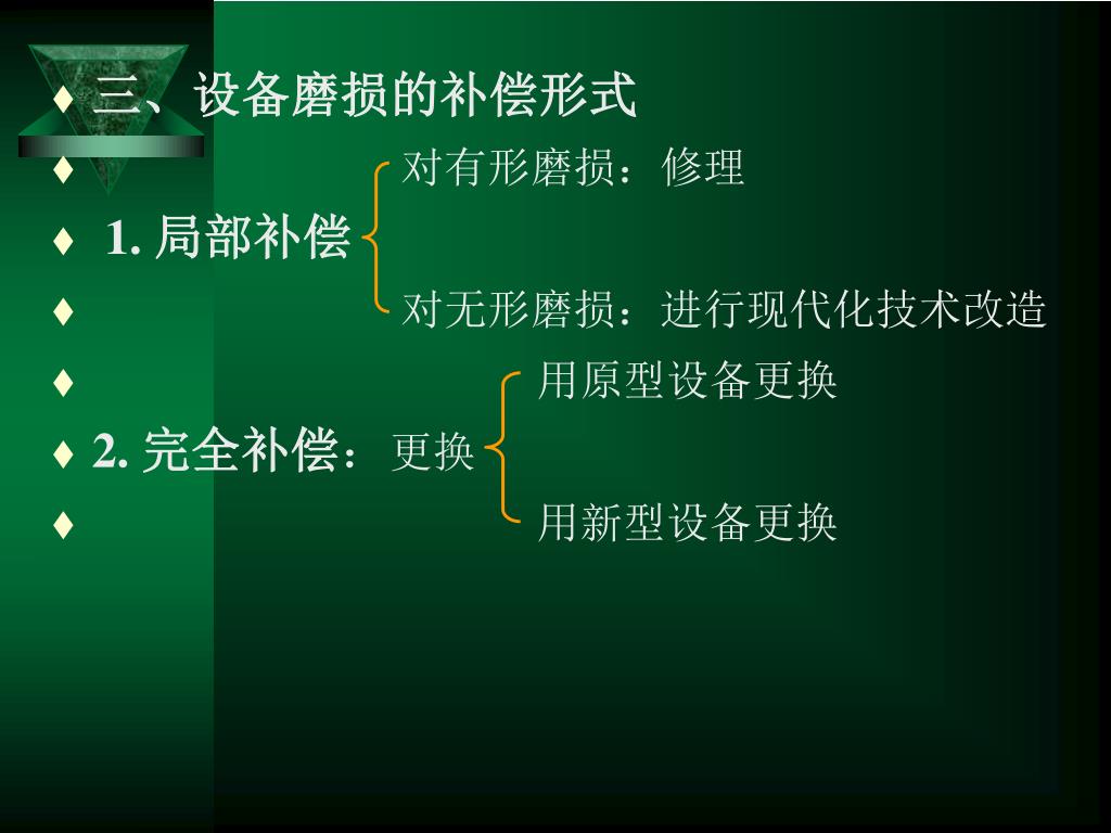 三、设备磨损的补偿形式 • 对有形磨损:修理 • 1. 局部补偿 • 对无形磨损:进行现代化技术改造 • 用原型设备更换 • 2. 完全补偿:更换 • 用新型设备更换