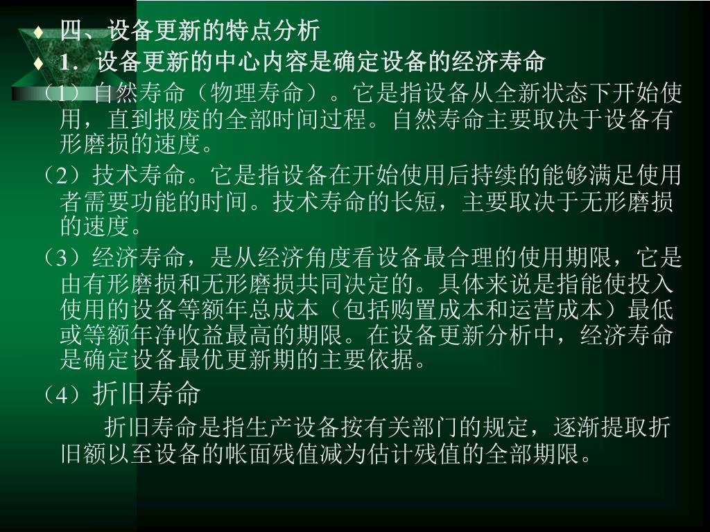 四、设备更新的特点分析 • 1.设备更新的中心内容是确定设备的经济寿命 (1)自然寿命(物理寿命)。它是指设备从全新状态下开始使用,直到报废的全部时间过程。自然寿命主要取决于设备有形磨损的速度。 (2)技术寿命。它是指设备在开始使用后持续的能够满足使用者需要功能的时间。技术寿命的长短,主要取决于无形磨损的速度。 (3)经济寿命,是从经济角度看设备最合理的使用期限,它是由有形磨损和无形磨损共同决定的。具体来说是指能使投入使用的设备等额年总成本(包括购置成本和运营成本)最低或等额年净收益最高的期限。在设备更新分析中,经济寿命是确定设备最优更新期的主要依据。 (4)折旧寿命 折旧寿命是指生产设备按有关部门的规定,逐渐提取折旧额以至设备的帐面残值减为估计残值的全部期限。