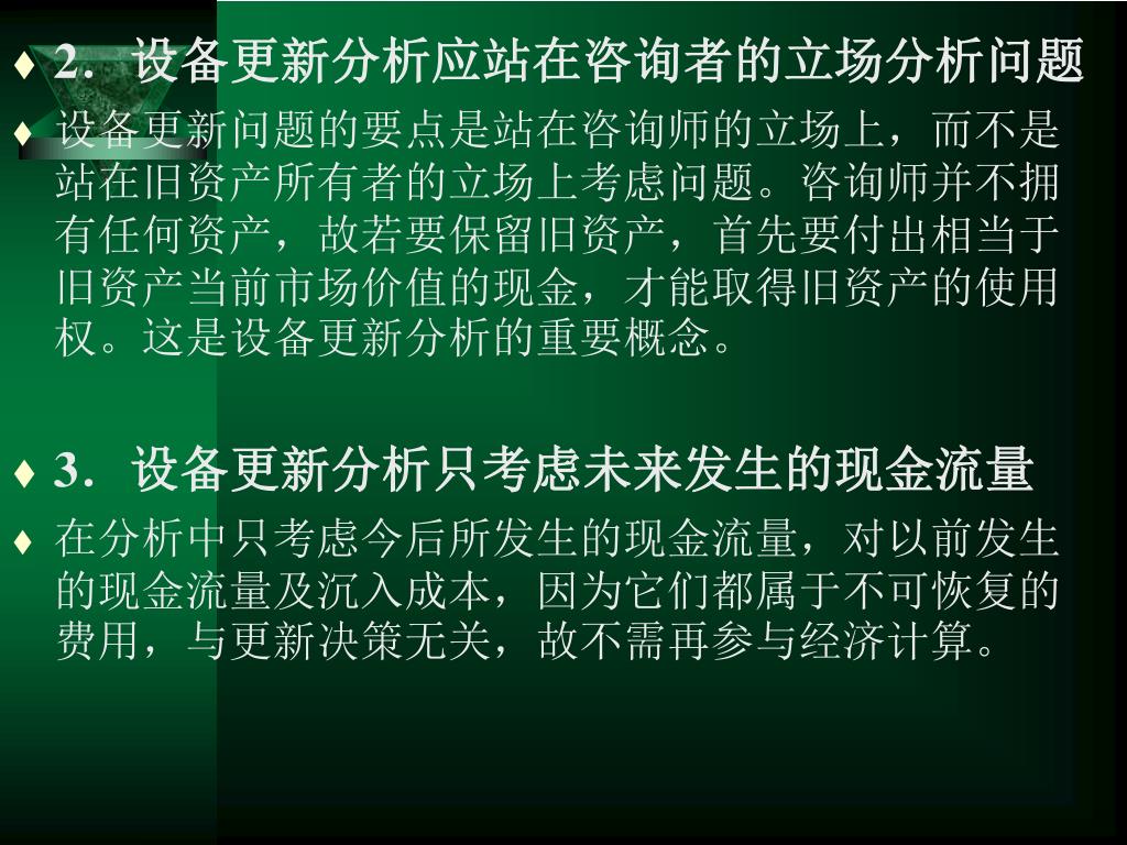 2.设备更新分析应站在咨询者的立场分析问题2.设备更新分析应站在咨询者的立场分析问题 • 设备更新问题的要点是站在咨询师的立场上,而不是站在旧资产所有者的立场上考虑问题。咨询师并不拥有任何资产,故若要保留旧资产,首先要付出相当于旧资产当前市场价值的现金,才能取得旧资产的使用权。这是设备更新分析的重要概念。 • 3.设备更新分析只考虑未来发生的现金流量 • 在分析中只考虑今后所发生的现金流量,对以前发生的现金流量及沉入成本,因为它们都属于不可恢复的费用,与更新决策无关,故不需再参与经济计算。