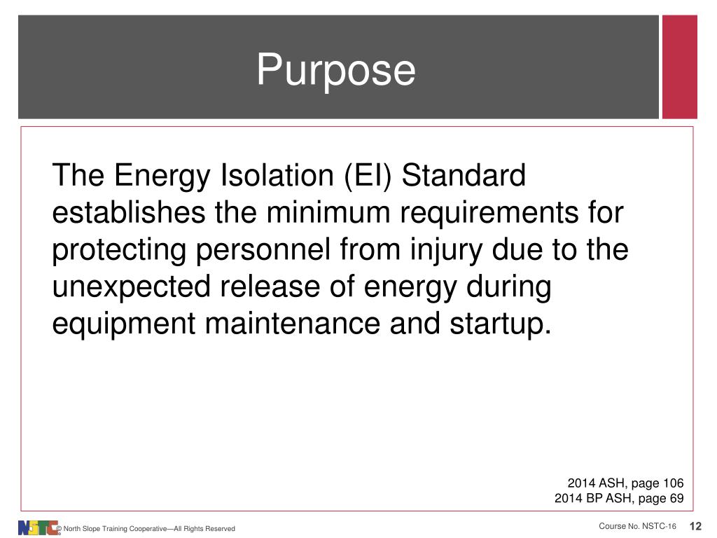 Purpose • The Energy Isolation (EI) Standard establishes the minimum requirements for protecting personnel from injury due to the unexpected release of energy during equipment maintenance and startup. 2014 ASH, page 106 2014 BP ASH, page 69