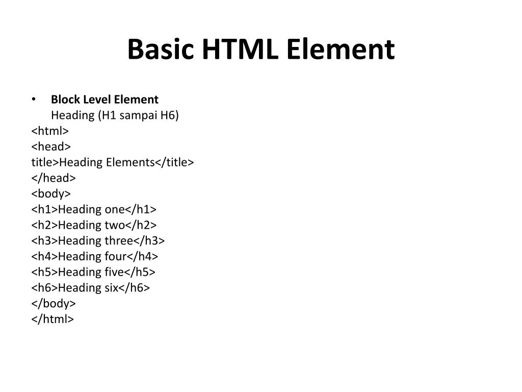Basic HTML Element • Block Level Element Heading (H1 sampai H6) <html> <head> title>Heading Elements</title> </head> <body> <h1>Heading one</h1> <h2>Heading two</h2> <h3>Heading three</h3> <h4>Heading four</h4> <h5>Heading five</h5> <h6>Heading six</h6> </body> </html>