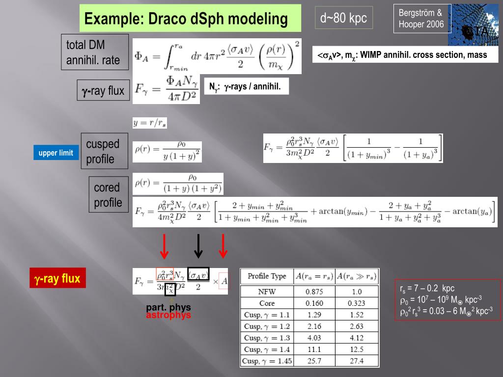 Bergström & Hooper 2006 d~80 kpc Example: DracodSphmodeling total DM annihil. rate <sAv>, mc: WIMP annihil. cross section, mass Ng: g-rays / annihil. g-rayflux cusped profile upperlimit cored profile g-rayflux rs = 7 – 0.2 kpc r0 = 107 – 109 Mž kpc-3 r02 rs3 = 0.03 – 6 Mž2 kpc-3 part. phys astrophys