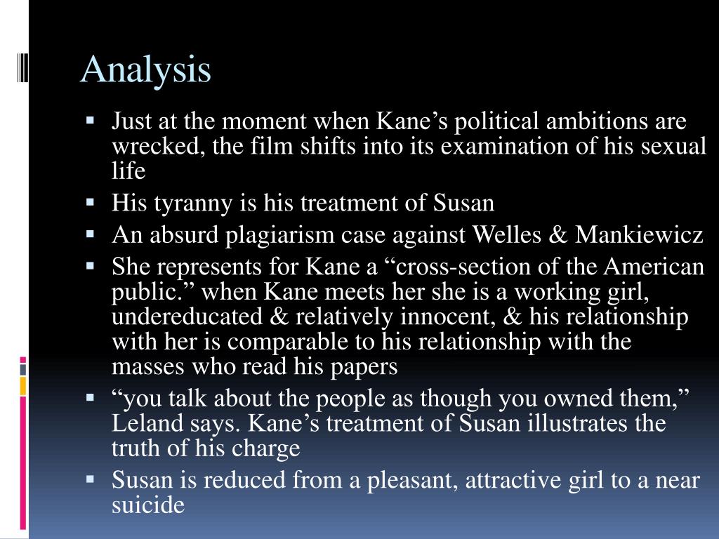 Analysis • Just at the moment when Kane’s political ambitions are wrecked, the film shifts into its examination of his sexual life • His tyranny is his treatment of Susan • An absurd plagiarism case against Welles & Mankiewicz • She represents for Kane a “cross-section of the American public.” when Kane meets her she is a working girl, undereducated & relatively innocent, & his relationship with her is comparable to his relationship with the masses who read his papers • “you talk about the people as though you owned them,” Leland says. Kane’s treatment of Susan illustrates the truth of his charge • Susan is reduced from a pleasant, attractive girl to a near suicide