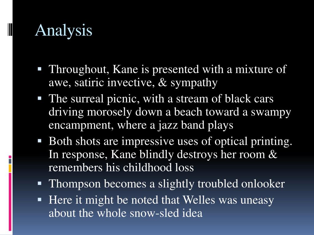 Analysis • Throughout, Kane is presented with a mixture of awe, satiric invective, & sympathy • The surreal picnic, with a stream of black cars driving morosely down a beach toward a swampy encampment, where a jazz band plays • Both shots are impressive uses of optical printing. In response, Kane blindly destroys her room & remembers his childhood loss • Thompson becomes a slightly troubled onlooker • Here it might be noted that Welles was uneasy about the whole snow-sled idea