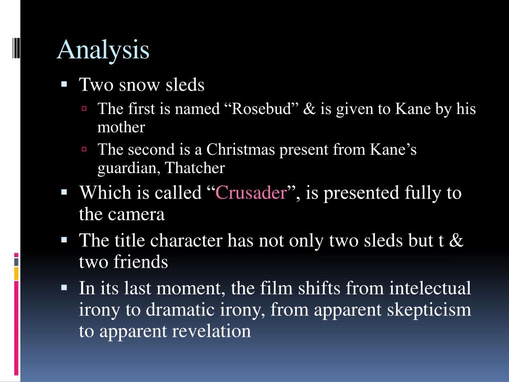 Analysis • Two snow sleds • The first is named “Rosebud” & is given to Kane by his mother • The second is a Christmas present from Kane’s guardian, Thatcher • Which is called “Crusader”, is presented fully to the camera • The title character has not only two sleds but t & two friends • In its last moment, the film shifts from intelectual irony to dramatic irony, from apparent skepticism to apparent revelation