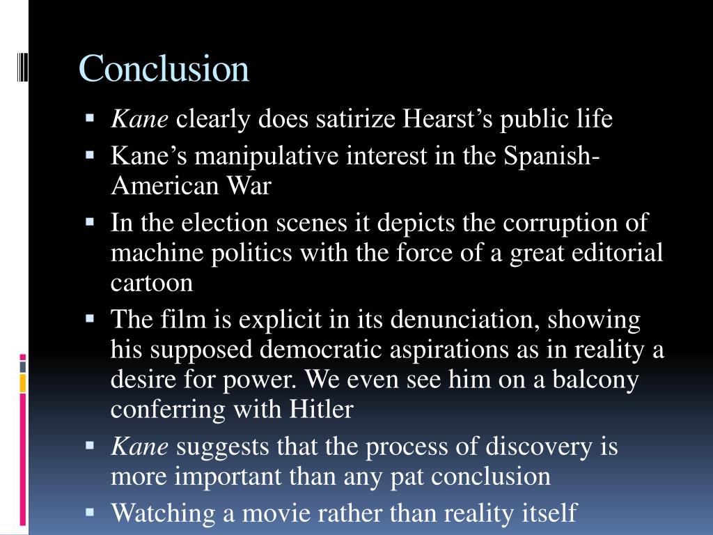 Conclusion • Kane clearly does satirize Hearst’s public life • Kane’s manipulative interest in the Spanish-American War • In the election scenes it depicts the corruption of machine politics with the force of a great editorial cartoon • The film is explicit in its denunciation, showing his supposed democratic aspirations as in reality a desire for power. We even see him on a balcony conferring with Hitler • Kane suggests that the process of discovery is more important than any pat conclusion • Watching a movie rather than reality itself
