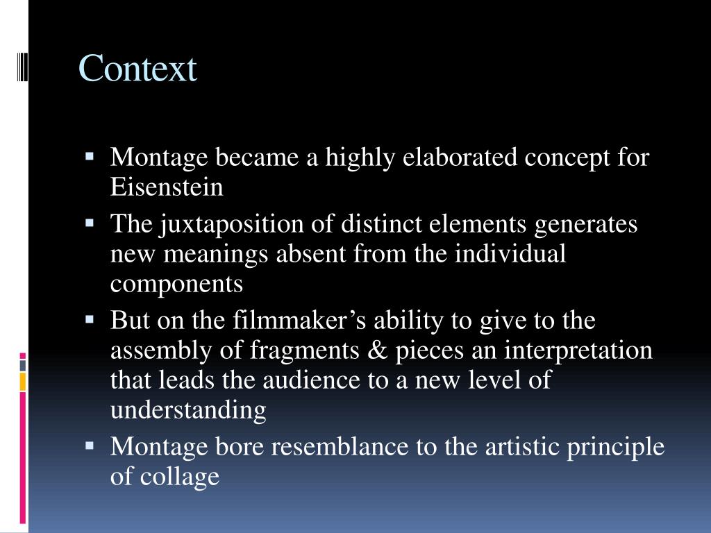 Context • Montage became a highly elaborated concept for Eisenstein • The juxtaposition of distinct elements generates new meanings absent from the individual components • But on the filmmaker’s ability to give to the assembly of fragments & pieces an interpretation that leads the audience to a new level of understanding • Montage bore resemblance to the artistic principle of collage