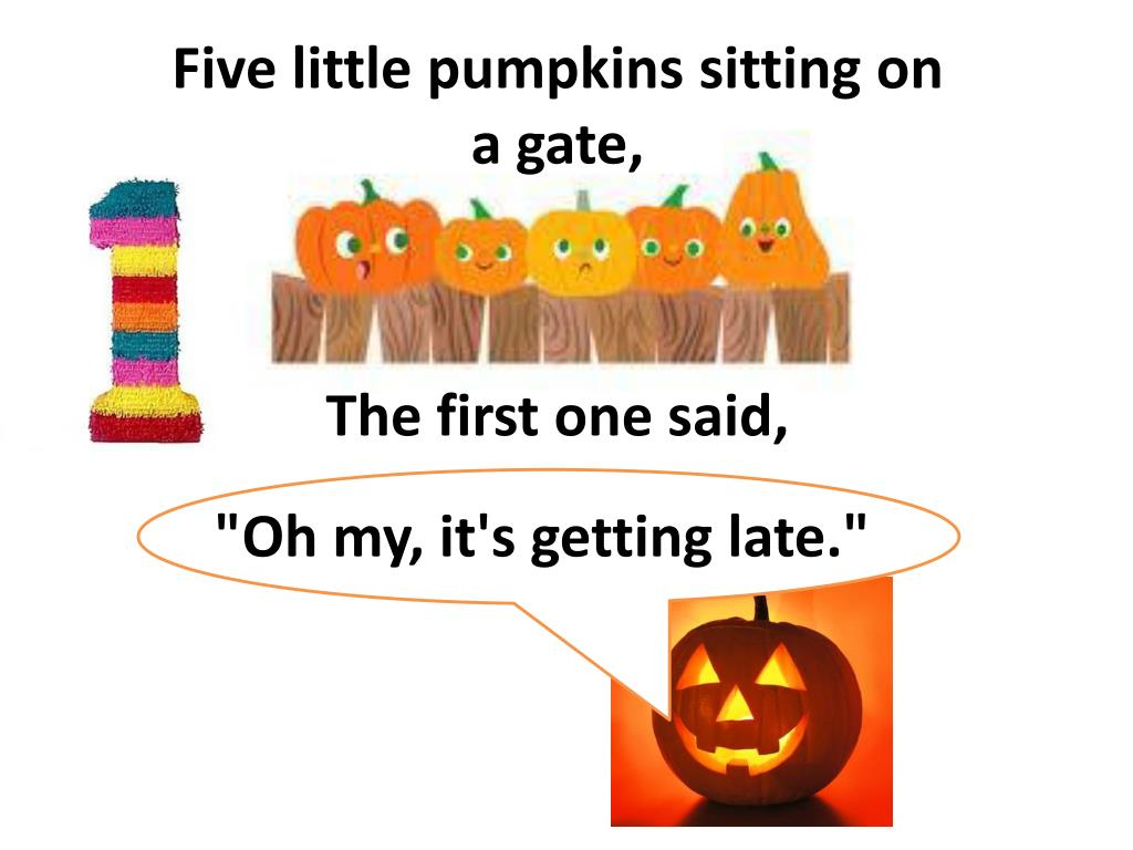 Five little pumpkins sitting on a gate, The first one said, "Oh my, it's getting late."