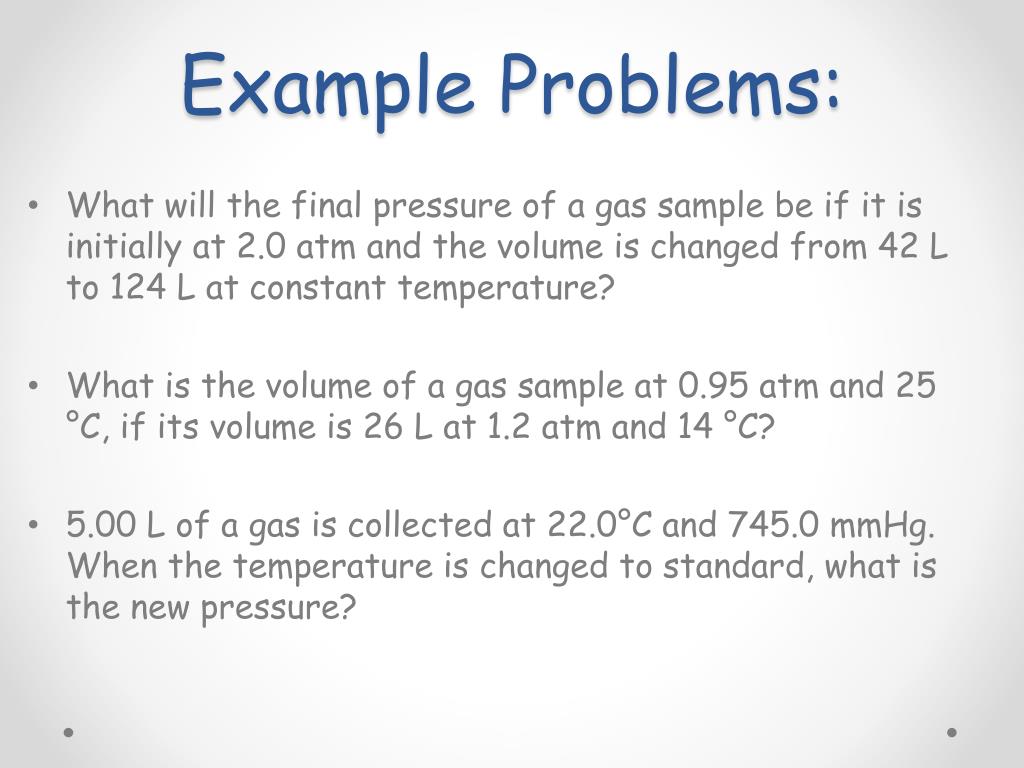 Example Problems: • What will the final pressure of a gas sample be if it is initially at 2.0 atm and the volume is changed from 42 L to 124 L at constant temperature? • What is the volume of a gas sample at 0.95 atm and 25 °C, if its volume is 26 L at 1.2 atm and 14 °C? • 5.00 L of a gas is collected at 22.0°C and 745.0 mmHg. When the temperature is changed to standard, what is the new pressure?
