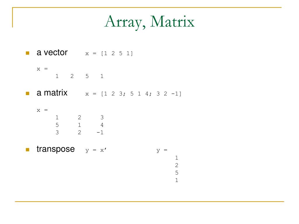 Array, Matrix • a vectorx = [1 2 5 1] x = 1 2 5 1 • a matrixx = [1 2 3; 5 1 4;3 2 -1] x = 1 2 3 5 1 4 3 2 -1 • transposey = x’ y = 1 2 5 1