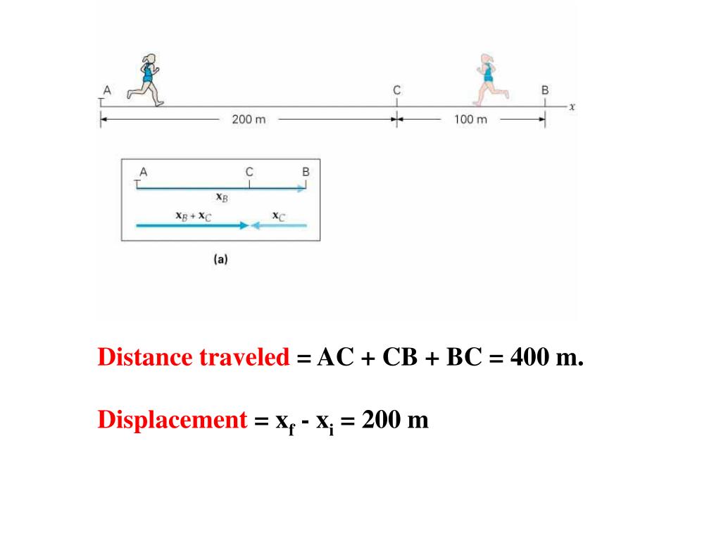 Distance traveled = AC + CB + BC = 400 m. Displacement = xf - xi = 200 m