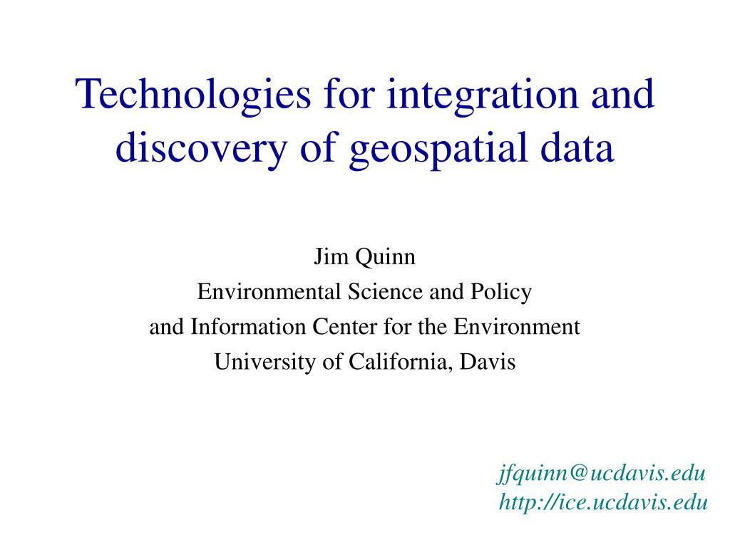 Technologies for integration and discovery of geospatial data Jim Quinn Environmental Science and Policy and Information Center for the Environment University of California, Davis jfquinn@ucdavis.edu http://ice.ucdavis.edu