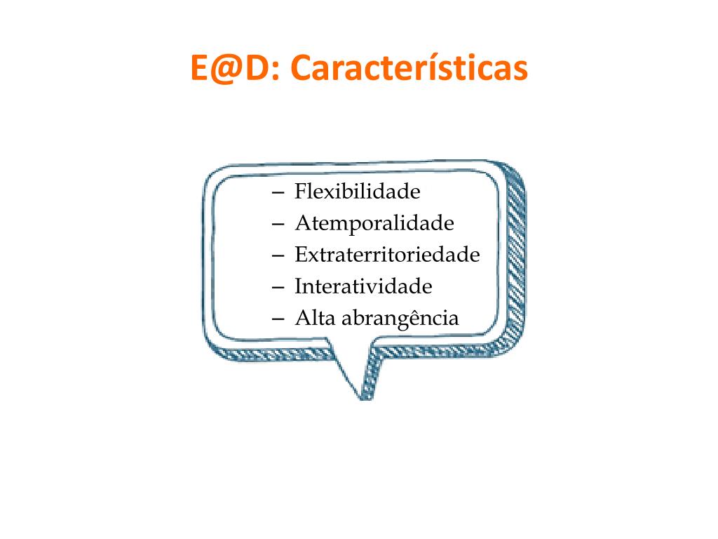 E@D: Características • Flexibilidade • Atemporalidade • Extraterritoriedade • Interatividade • Alta abrangência