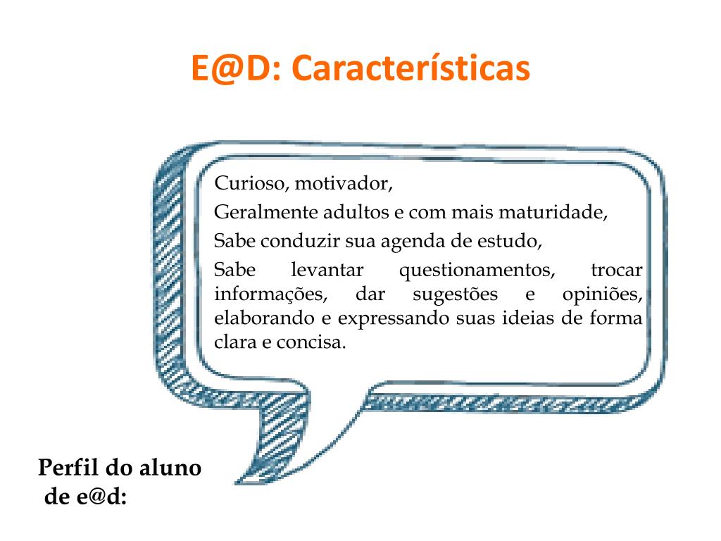 E@D: Características Curioso, motivador, Geralmente adultos e com mais maturidade, Sabe conduzir sua agenda de estudo, Sabe levantar questionamentos, trocar informações, dar sugestões e opiniões, elaborando e expressando suas ideias de forma clara e concisa. Perfil do aluno de e@d: