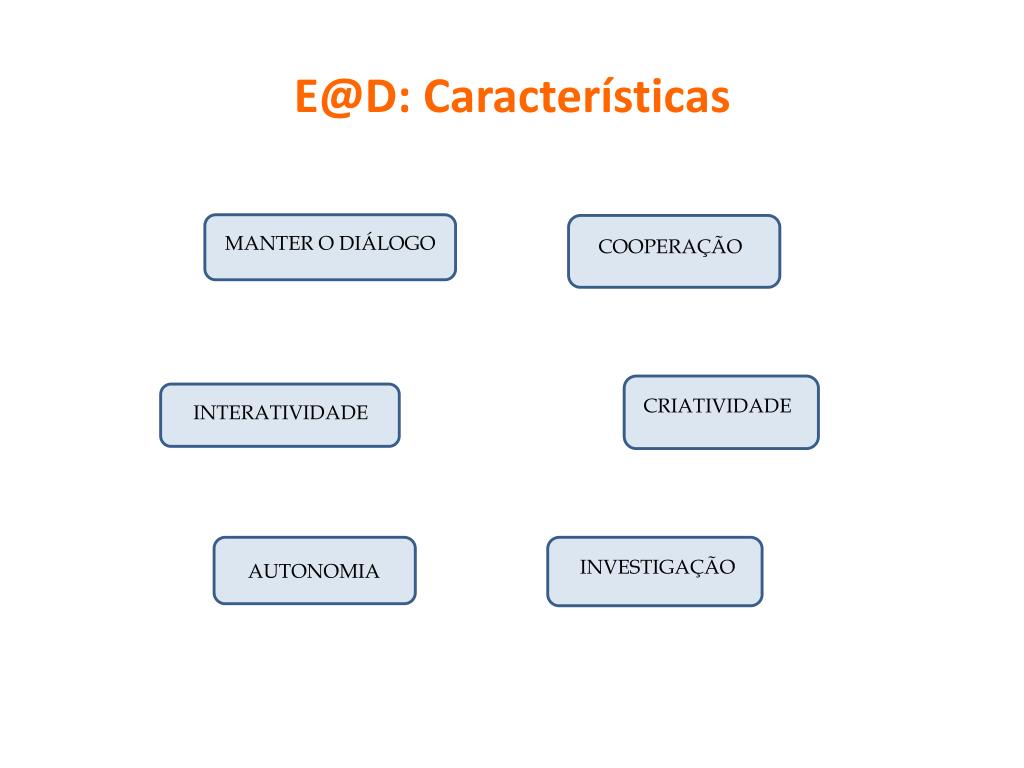 E@D: Características INVESTIGAÇÃO AUTONOMIA MANTER O DIÁLOGO COOPERAÇÃO CRIATIVIDADE INTERATIVIDADE