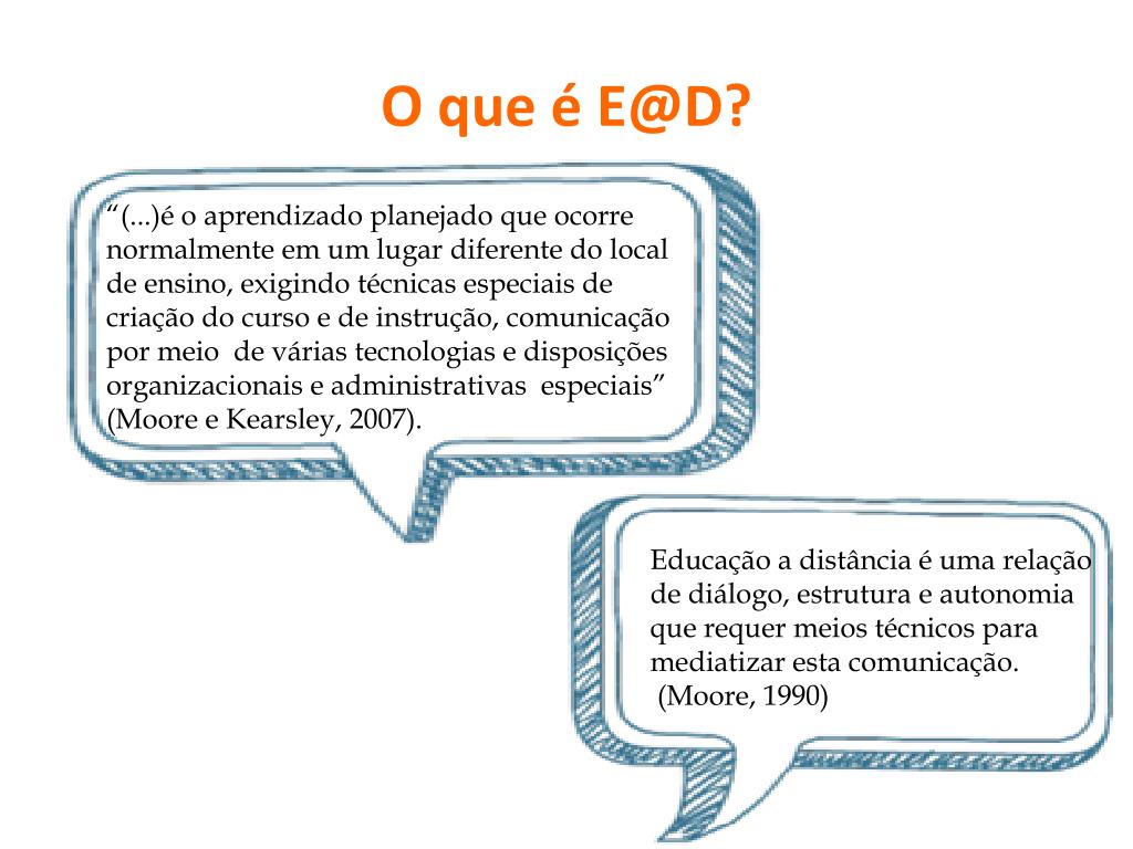O que é E@D? “(...)é o aprendizado planejado que ocorre normalmente em um lugar diferente do local de ensino, exigindo técnicas especiais de criação do curso e de instrução, comunicação por meio de várias tecnologias e disposições organizacionais e administrativas especiais” (Moore e Kearsley, 2007). Educação a distância é uma relação de diálogo, estrutura e autonomia que requer meios técnicos para mediatizar esta comunicação. (Moore, 1990)