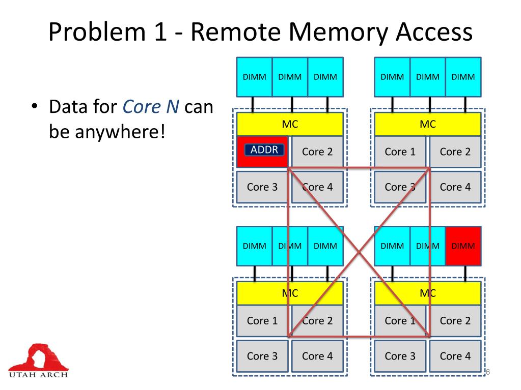 Problem 1 - Remote Memory Access DIMM DIMM DIMM DIMM DIMM DIMM • Data for Core N can be anywhere! MC MC Core 1 Core 2 Core 1 Core 2 Core 3 Core 4 Core 3 Core 4 Socket 1 DIMM DIMM DIMM DIMM DIMM DIMM DATA MC MC Core 1 Core 2 Core 1 Core 2 Core 3 Core 4 Core 3 Core 4