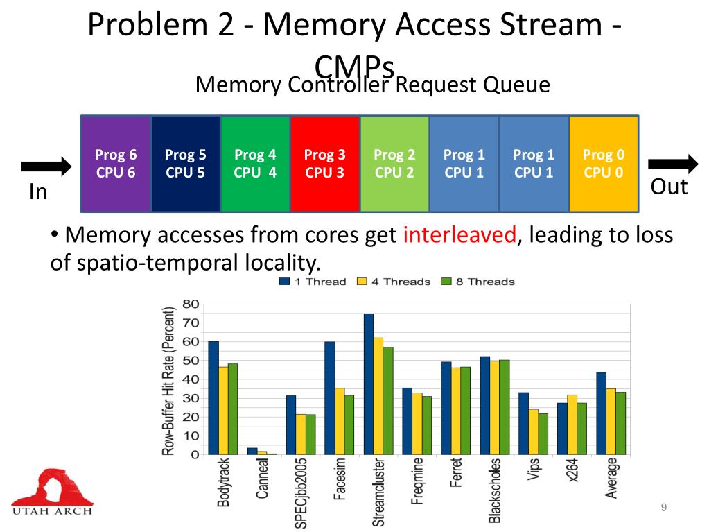 Problem 2 - Memory Access Stream - CMPs Memory Controller Request Queue Prog 6 CPU 6 Prog 5 CPU 5 Prog 4 CPU 4 Prog 3 CPU 3 Prog 2 CPU 2 Prog 1 CPU 1 Prog 1 CPU 1 Prog 0 CPU 0 Out In • Memory accesses from cores get interleaved, leading to loss of spatio-temporal locality.