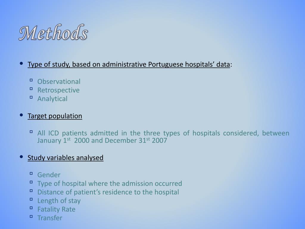 Methods • Type of study, based on administrative Portuguese hospitals’ data: • Observational • Retrospective • Analytical • Target population • All ICD patients admitted in the three types of hospitals considered, between January 1st 2000 and December 31st 2007 • Study variables analysed • Gender • Type of hospital where the admission occurred • Distance of patient’s residence to the hospital • Length of stay • Fatality Rate • Transfer
