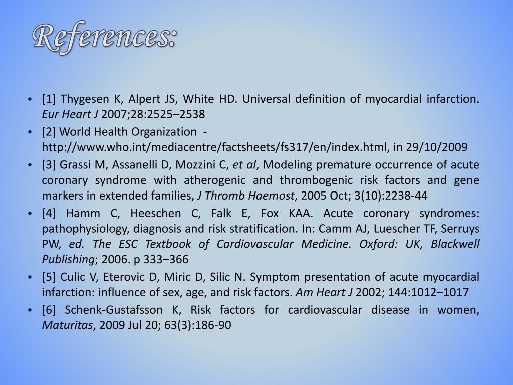 References: • [1]Thygesen K, Alpert JS, White HD. Universal definition of myocardial infarction. Eur Heart J 2007;28:2525–2538 • [2] World Health Organization -http://www.who.int/mediacentre/factsheets/fs317/en/index.html, in 29/10/2009 • [3] Grassi M, Assanelli D, Mozzini C, et al, Modeling premature occurrence of acute coronary syndrome with atherogenic and thrombogenic risk factors and gene markers in extended families, J ThrombHaemost, 2005 Oct; 3(10):2238-44 • [4] Hamm C, Heeschen C, Falk E, Fox KAA. Acute coronary syndromes: pathophysiology, diagnosis and risk stratification. In: Camm AJ, Luescher TF, Serruys PW, ed. The ESC Textbook of Cardiovascular Medicine. Oxford: UK, Blackwell Publishing; 2006. p 333–366 • [5] Culic V, Eterovic D, Miric D, Silic N. Symptom presentation of acute myocardial infarction: influence of sex, age, and risk factors. Am Heart J 2002; 144:1012–1017 • [6] Schenk-Gustafsson K, Risk factors for cardiovascular disease in women, Maturitas, 2009 Jul 20; 63(3):186-90