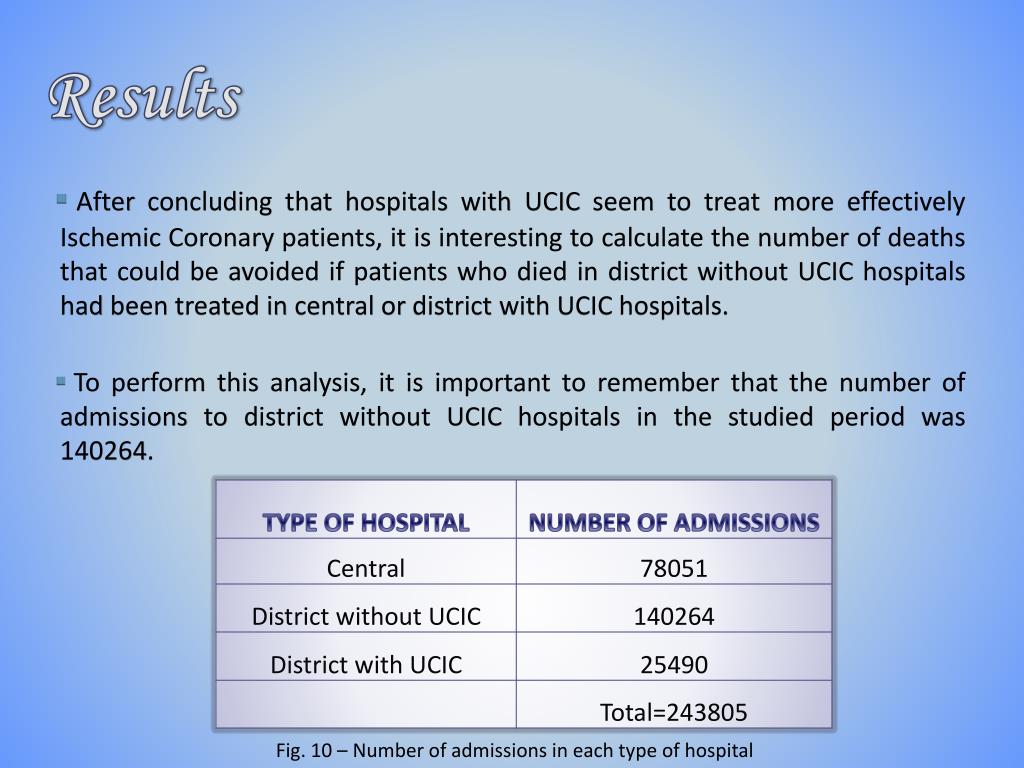 Results • After concluding that hospitals with UCIC seem to treatmore effectively Ischemic Coronary patients, it is interesting to calculate the number of deaths that could be avoided if patients who died in district without UCIC hospitals had been treated in central or district with UCIC hospitals. • To perform this analysis, it is important to remember that the number of admissions to district without UCIC hospitals in the studied period was 140264. Fig.10 – Number of admissions in each type of hospital