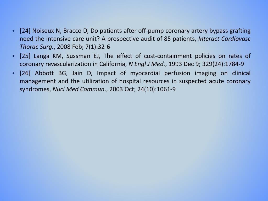 [24] Noiseux N, Bracco D, Do patients after off-pump coronary artery bypass grafting need the intensive care unit? A prospective audit of 85 patients, Interact CardiovascThorac Surg., 2008 Feb; 7(1):32-6 • [25] Langa KM, Sussman EJ, The effect of cost-containment policies on rates of coronary revascularization in California, N Engl J Med., 1993 Dec 9; 329(24):1784-9 • [26] Abbott BG, Jain D, Impact of myocardial perfusion imaging on clinical management and the utilization of hospital resources in suspected acute coronary syndromes, Nucl Med Commun., 2003 Oct; 24(10):1061-9