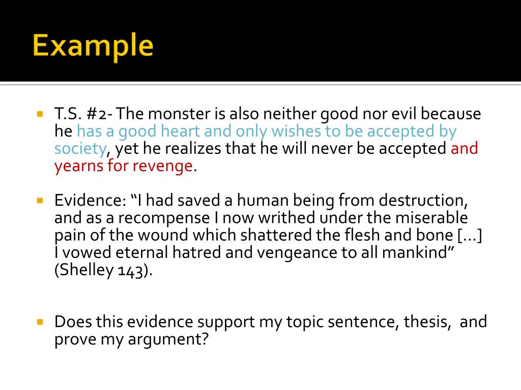 Example • T.S. #2- The monster is also neither good nor evil because he has a good heart and only wishes to be accepted by society, yet he realizes that he will never be accepted and yearns for revenge. • Evidence: “I had saved a human being from destruction, and as a recompense I now writhed under the miserable pain of the wound which shattered the flesh and bone[…] I vowed eternal hatred and vengeance to all mankind” (Shelley 143). • Does this evidence support my topic sentence, thesis, and prove my argument?