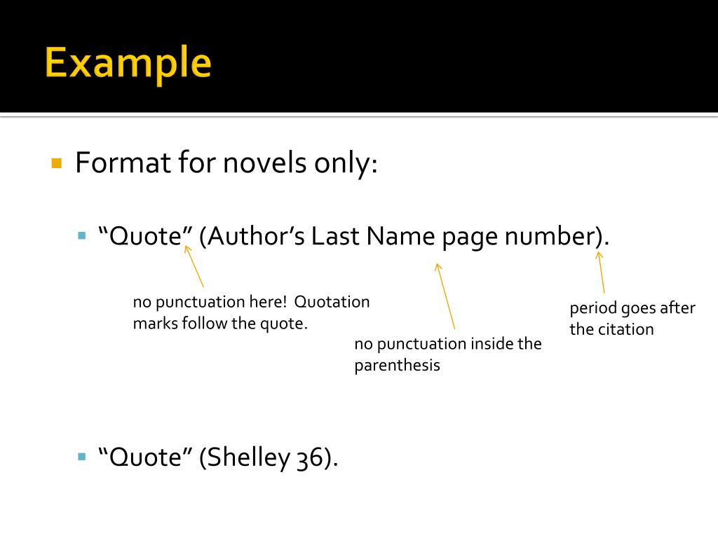 Example • Format for novels only: • “Quote” (Author’s Last Name page number). • “Quote” (Shelley 36). no punctuation here! Quotation marks follow the quote. period goes after the citation no punctuation inside the parenthesis