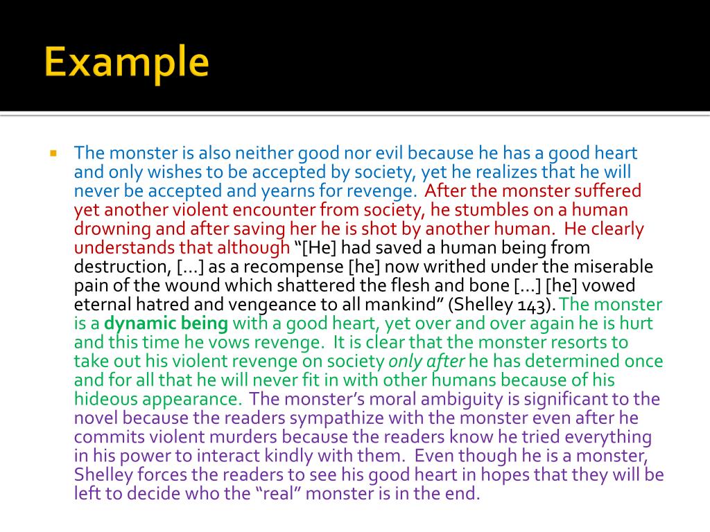 Example • The monster is also neither good nor evil because he has a good heart and only wishes to be accepted by society, yet he realizes that he will never be accepted and yearns for revenge. After the monster suffered yet another violent encounter from society, he stumbles on a human drowning and after saving her he is shot by another human. He clearly understands that although “[He] had saved a human being from destruction, [...] as a recompense [he] now writhed under the miserable pain of the wound which shattered the flesh and bone[…][he] vowed eternal hatred and vengeance to all mankind” (Shelley 143). The monster is a dynamic being with a good heart, yet over and over again he is hurt and this time he vows revenge. It is clear that the monster resorts to take out his violent revenge on society only after he has determined once and for all that he will never fit in with other humans because of his hideous appearance. The monster’s moral ambiguity is significant to the novel because the readers sympathize with the monster even after he commits violent murders because the readers know he tried everything in his power to interact kindly with them. Even though he is a monster, Shelley forces the readers to see his good heart in hopes that they will be left to decide who the “real” monster is in the end.