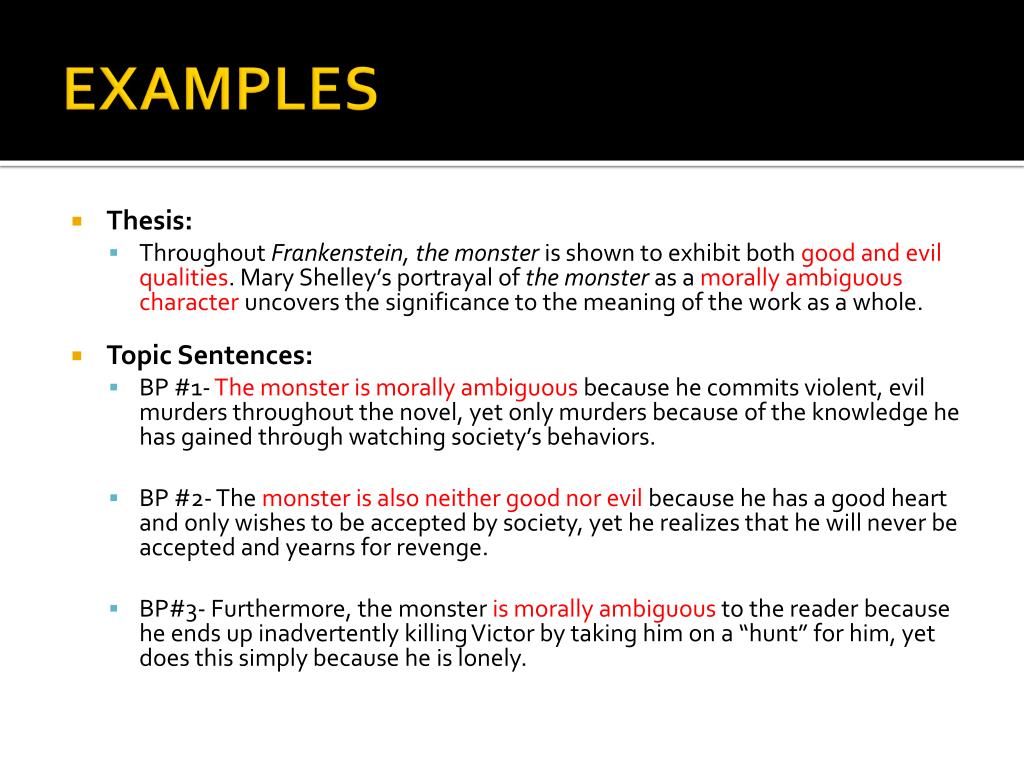 EXAMPLES • Thesis: • Throughout Frankenstein,the monster is shown to exhibit both good and evil qualities. Mary Shelley’s portrayal of the monster as a morally ambiguous character uncovers the significance to the meaning of the work as a whole. • Topic Sentences: • BP #1- The monster is morally ambiguous because he commits violent, evil murders throughout the novel, yet only murders because of the knowledge he has gained through watching society’s behaviors. • BP #2- The monster is also neither good nor evil because he has a good heart and only wishes to be accepted by society, yet he realizes that he will never be accepted and yearns for revenge. • BP#3- Furthermore, the monster is morally ambiguous to the reader because he ends up inadvertently killing Victor by taking him on a “hunt” for him, yet does this simply because he is lonely.